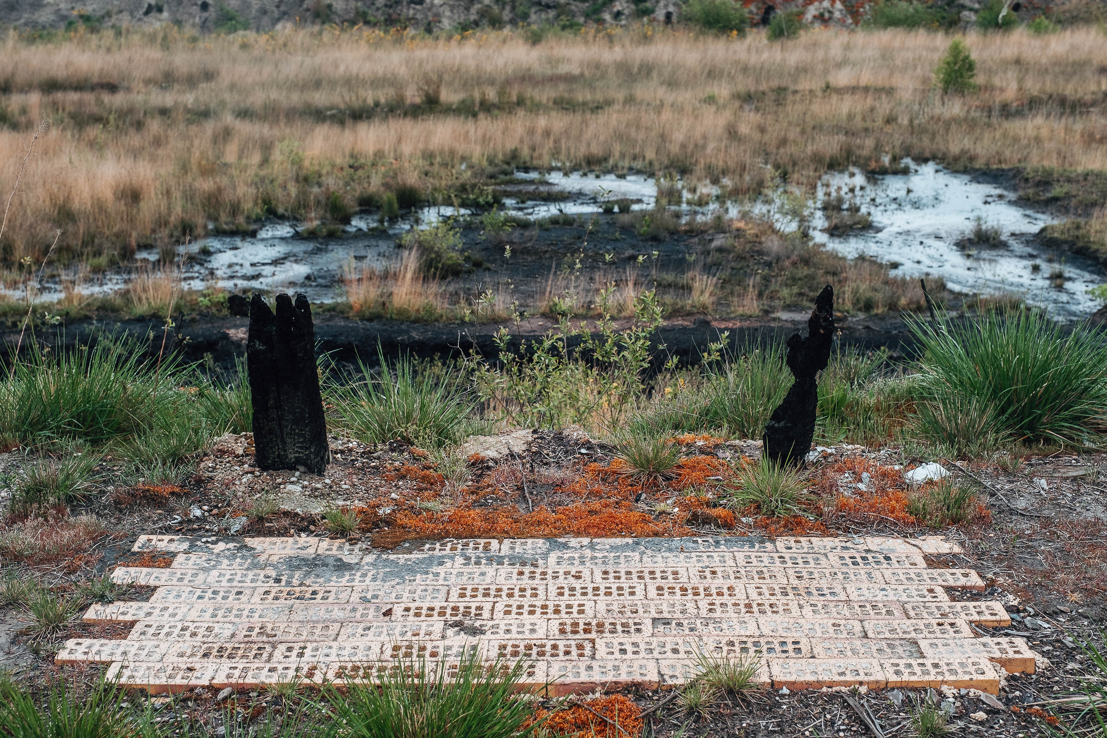 Avant de quitter Hostens, nous prenons le temps d’observer l’ENS qui fait face au centre équestre. Les contrastes de couleur sont saissants, presque étranges. Le sol noir, mis à nu par les engins, la mousse rouge orangé, les arbres calcinés, cotoient la végétation basse qui reverdit. Le paysage fait étalage d’une palette colorimétrique très curieuse.