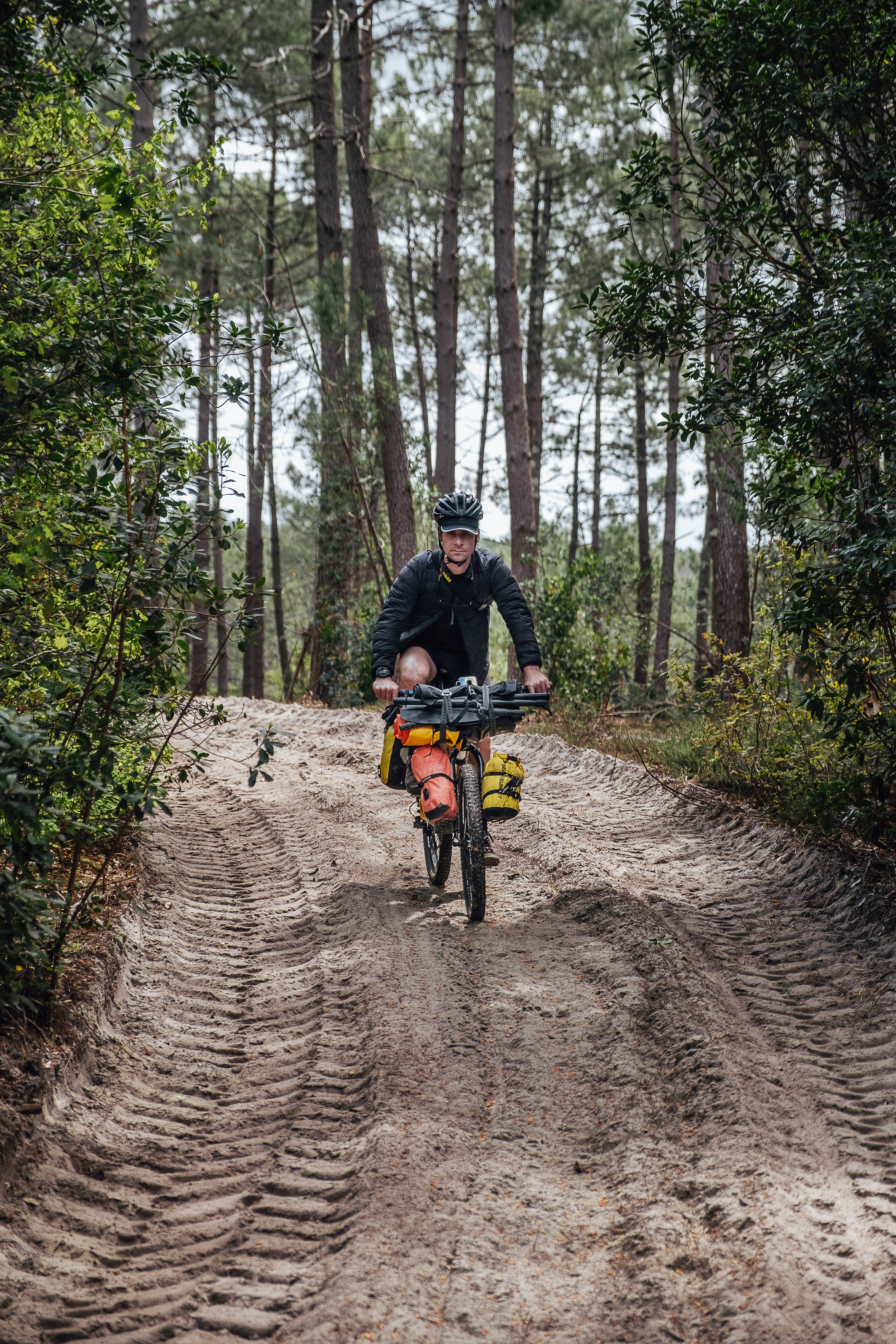 Nous faisons une halte à l’entrée dela piste 214. Le secrétariat de Pascale Got nous contacte pour décaler le rendez-vous prévu le lendemain de 16h30 à 9h. Impossible d’y être dans les délais à moins de pédaler une bonne partie de la soirée. Et vu le temps que nous venons de passer à pousser les vélos dans le sable, l’énergie manque. Nous improvisons un plan B, et décidons de sauter dans un train à la fin de la journée pour rentrer à Bordeaux en train, et rejoindre Saumos en voiture le lendemain. Chance en est pour Pascale Got, nous serons propres.
