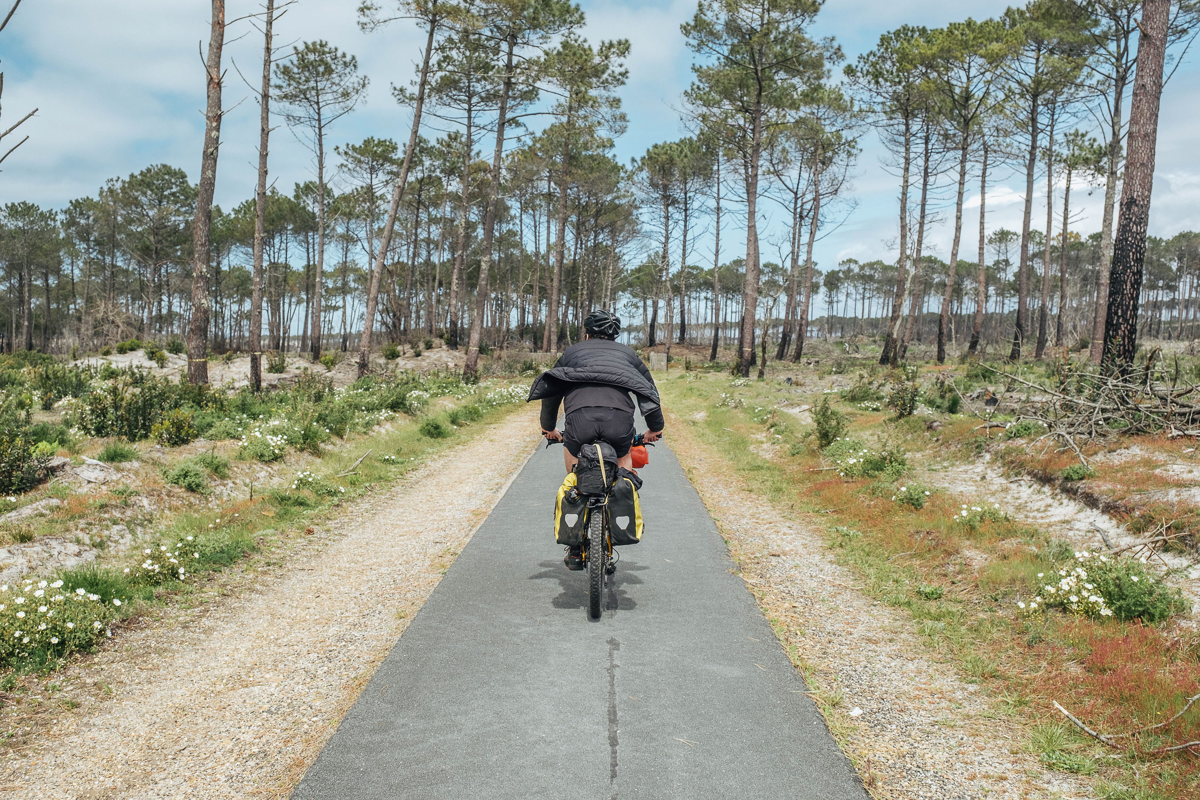 Sur la route pour La Teste, nous décidons de faire un dernier détour dans la forêt usagère. À la recherche des cabanes touchées par l’incendie. Nous sommes tout au nord de la Forêt, sur la piste cyclable qui longe la D259, le boulevard des Portes de l’Océan, route prisée des vacancier·ères qui se rendent sur le littoral.
